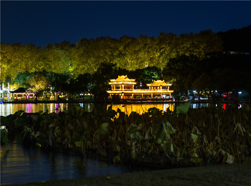 杭州夜色下西湖边上建筑群灯光秀,梦回唐朝